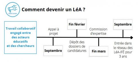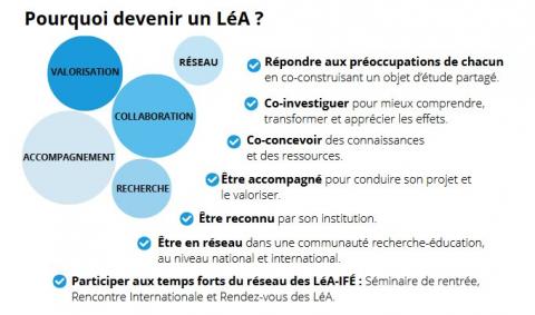 - Le réseau LéA-IFÉ existe depuis 2011 et réunit chaque année plusieurs dizaines de projets, des centaines d’acteurs éducatifs et des unités de recherche, pour produire des connaissances et des ressources utiles à la communauté éducative. (Contacts)